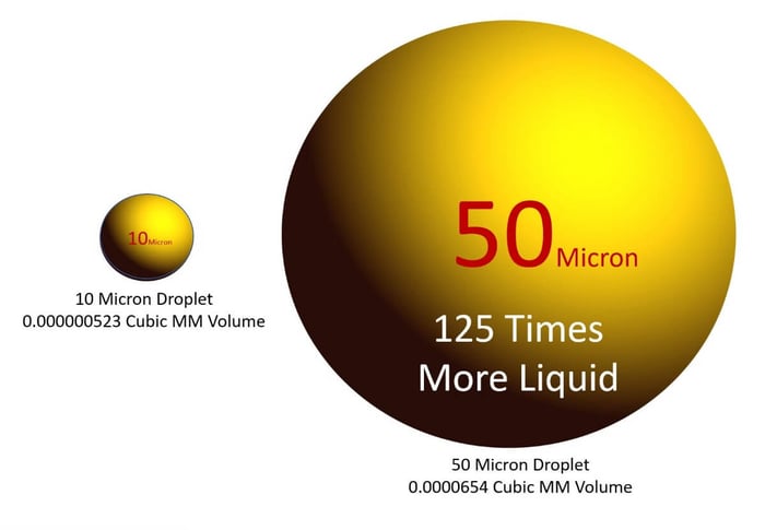 One of the most important concepts in sanitizing is droplet size, measured in microns. Droplets are spherical, meaning their volume increases exponentially as micron size increases.