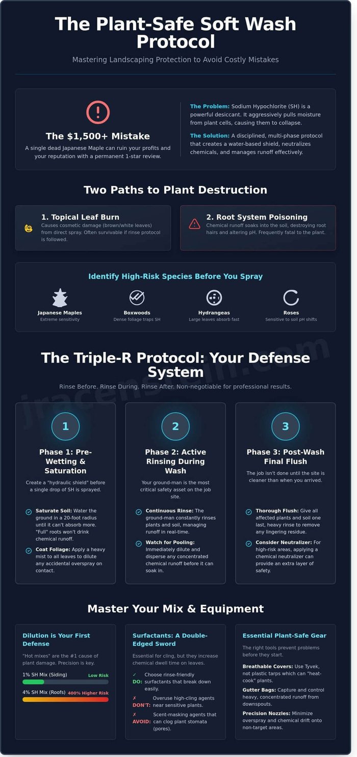 A single dead Japanese Maple can cost a contractor over $1,500 in replacement fees—and leave you with a one-star review that lingers for years. While sodium hypochlorite (SH) is the industry standard for removing organic growth, it remains one of the biggest liabilities on any job site. Mastering how to avoid killing plants when soft washing isn’t optional—it’s the difference between scaling your business safely or dealing with constant damage claims.