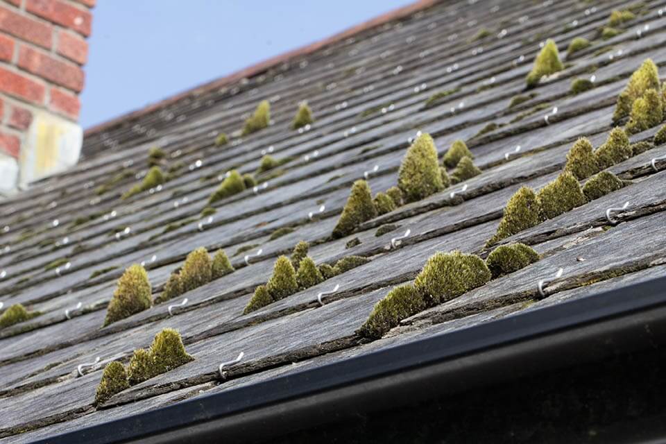 Moss thrives on roofs in cooler, shaded, and damp areas, often on north-facing slopes or under overhanging trees. It spreads through spores and absorbs water through its leaves, allowing it to survive directly on shingles or tiles.